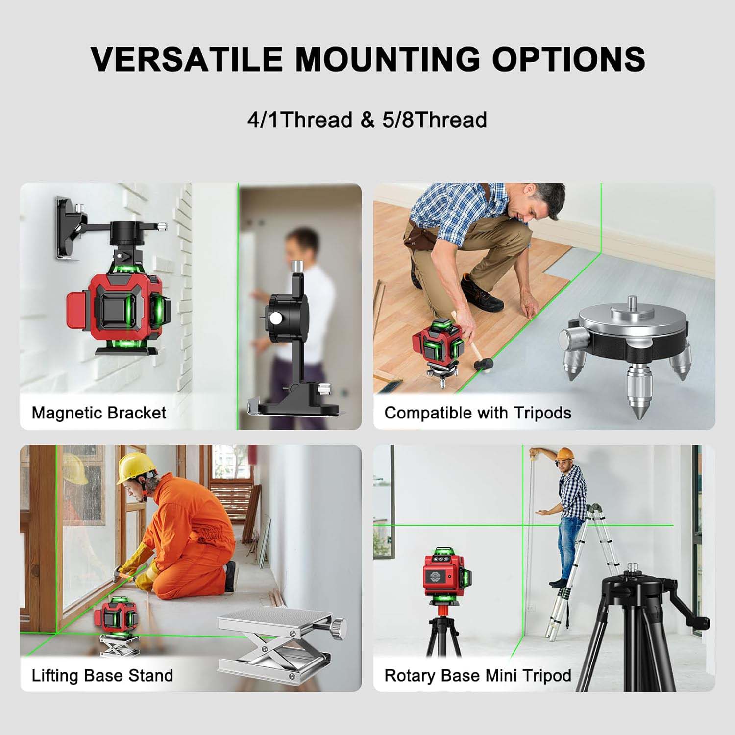 1. Phương pháp sửa chữa đa dạng:Nó được trang bị một giá đỡ từ tính mạnh, giúp cố định mức laser một cách ổn định và thuận tiện trong nhiều tình huống. Giá đỡ ren 5/8 - 20" cho phép kết nối với các thiết bị hoặc cấu trúc cụ thể bằng loại ren này. Giá đỡ ren 1/4" cũng cung cấp một tùy chọn khác để lắp, tăng khả năng tương thích với các phụ kiện khác nhau.
